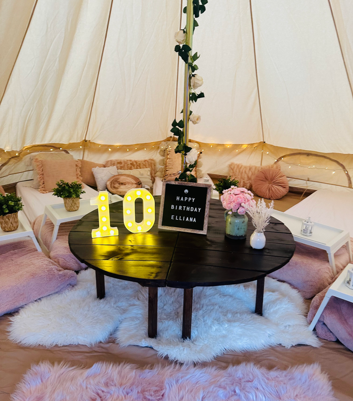Imagine being in a cozy outdoor tent with your besties, twinkling white lights, plush bedding, stylish themed decor, and the sound of nature around you!